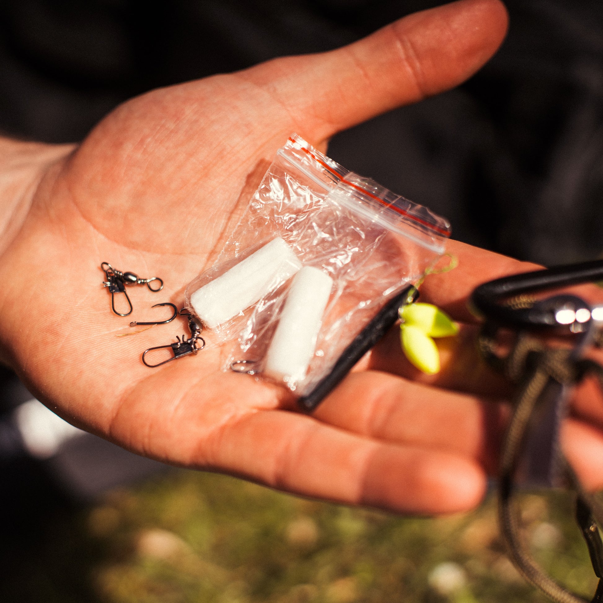 - fishing set (2 hooks, 2 fishing lines, 2 swivels, 2 baits, 2 weights)